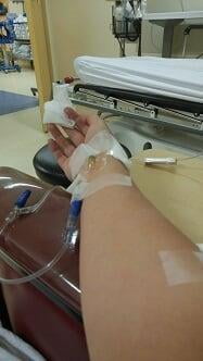 #2 made her attempts. First attempt was on the inside of my left elbow, and it didn’t work. Then on my left wrist, then back to my right arm wrist. Then, she was frustrated. If she was frustrated, how about me?? Then she brought me a warmed blanket to put around my both arms, she said it would help to make my veins pop up.