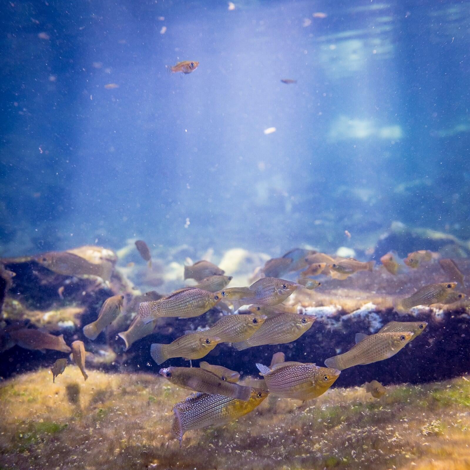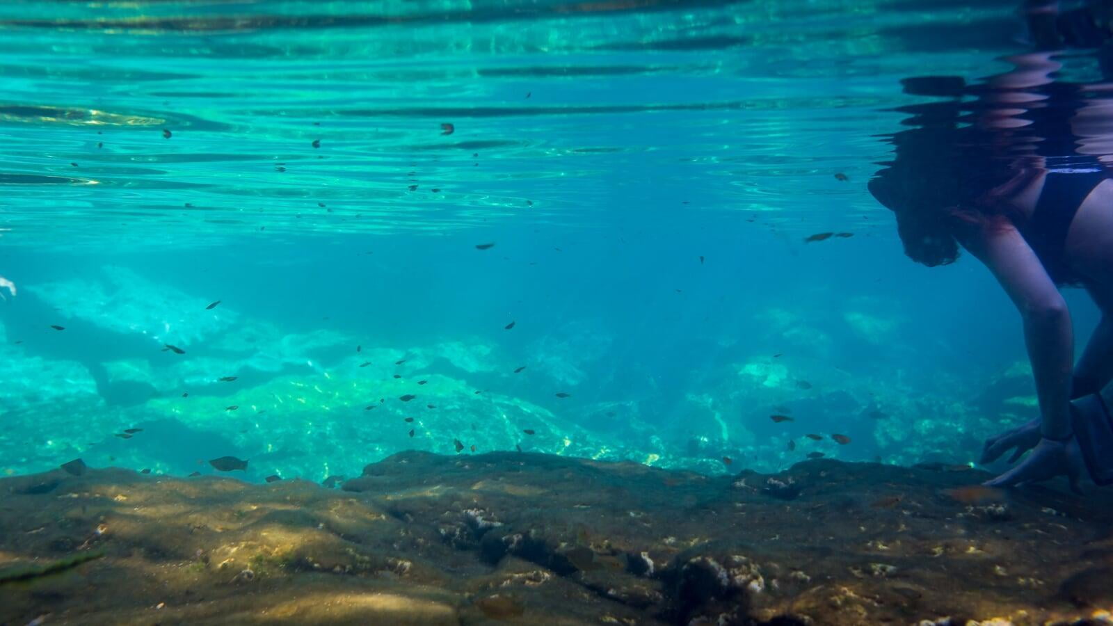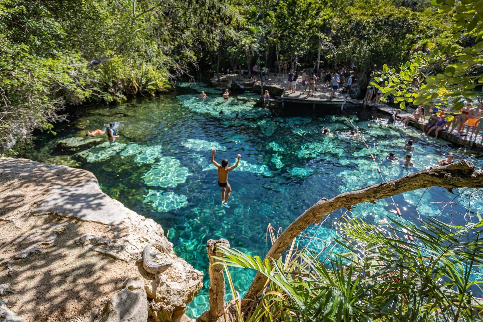 There is a cliff on one side of the cenote where you can jump right in the deeper part of the cenote, and the other side is the shallow part of the cenote full of guppy fishes. Imagine a natural giant fish spa.