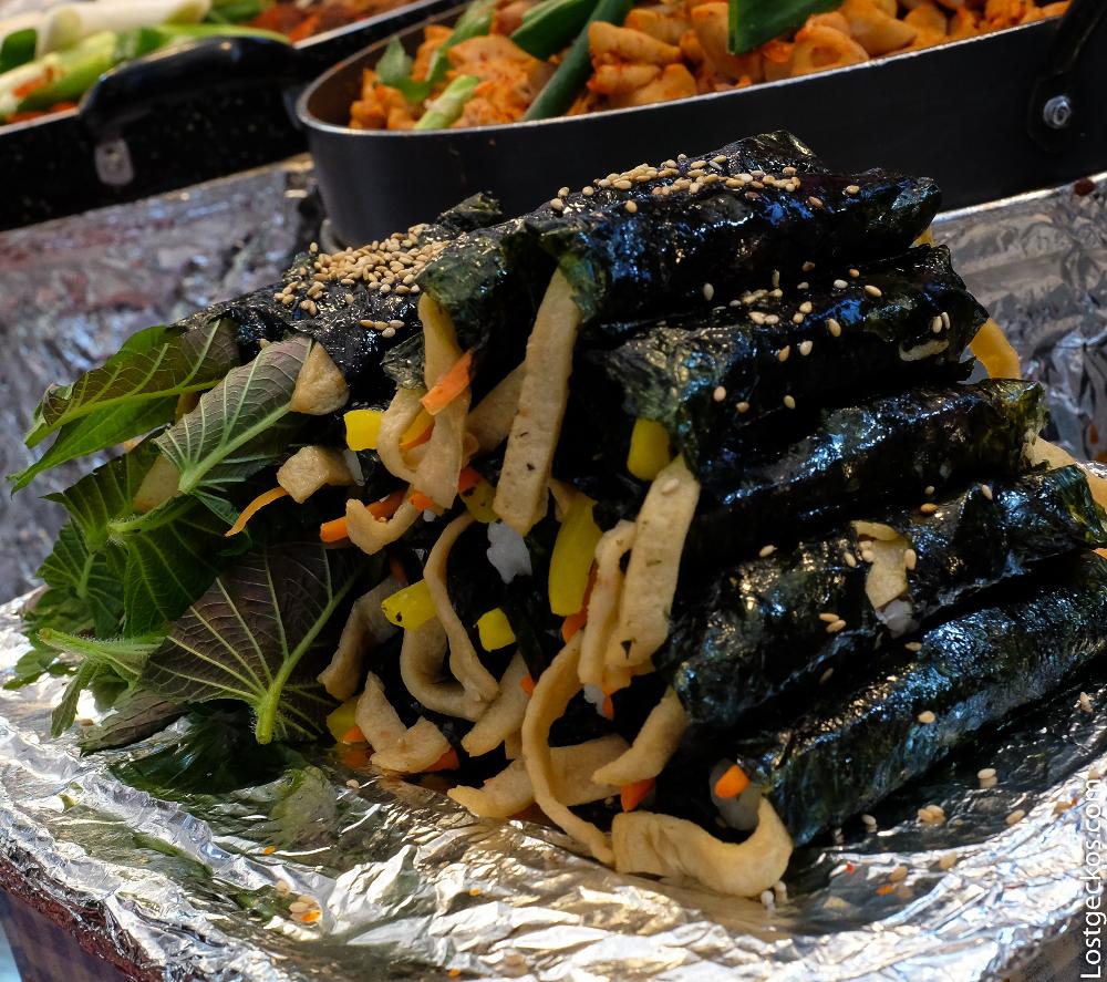 There's nothing deadly for me in this pic on the right, which displays a tiny mountain of colorful gimbap next to slow-cooked pig snout and knuckles. Both awesome and grotesque at the same time