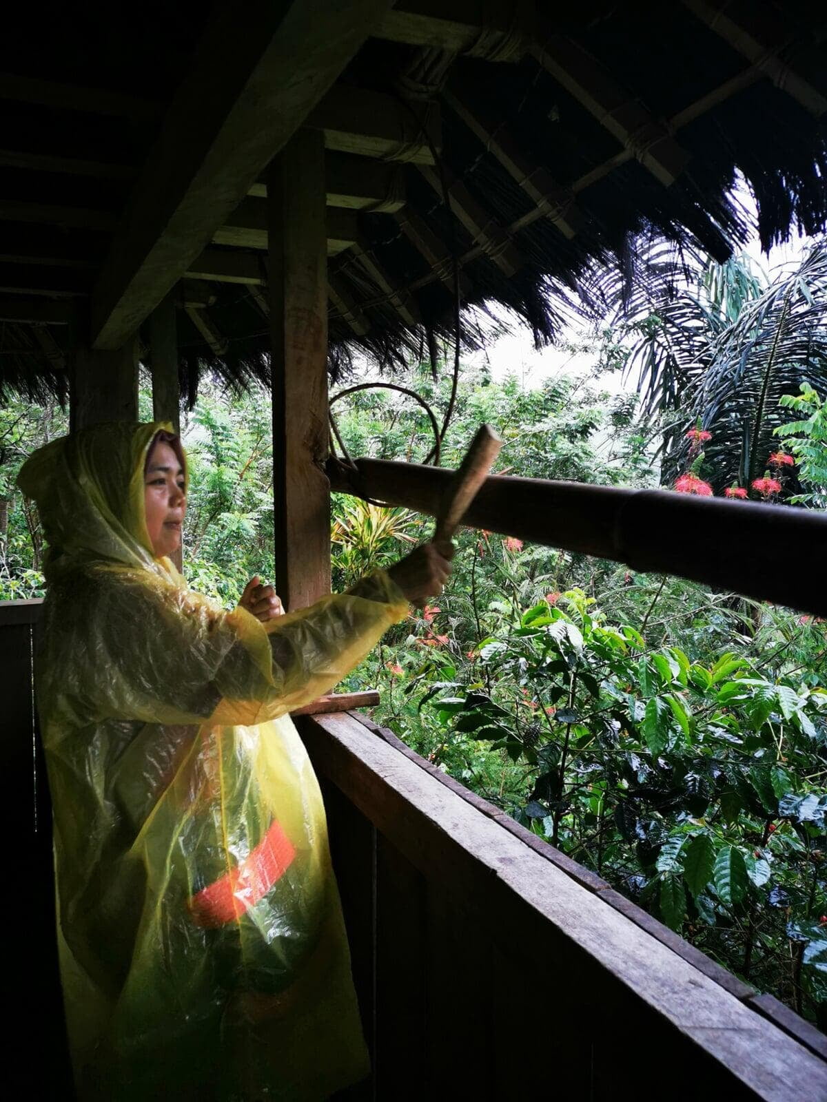 Around another hour or so, we reached the last pitstop, the Hut. Our Plant-root McGyver explained that arriving guests should announce themselves with a good ol' fashioned bamboo beatdown. Think of it as a traditional doorbell, minus the delightful "ding-dong." The instructions? Beat the bamboo – like, literally whack it with a stick. I let Dian to have the honour to announce signal our arrival. So there she was, channeling her inner jungle beatboxing skill in our customary yellow rain poncho.