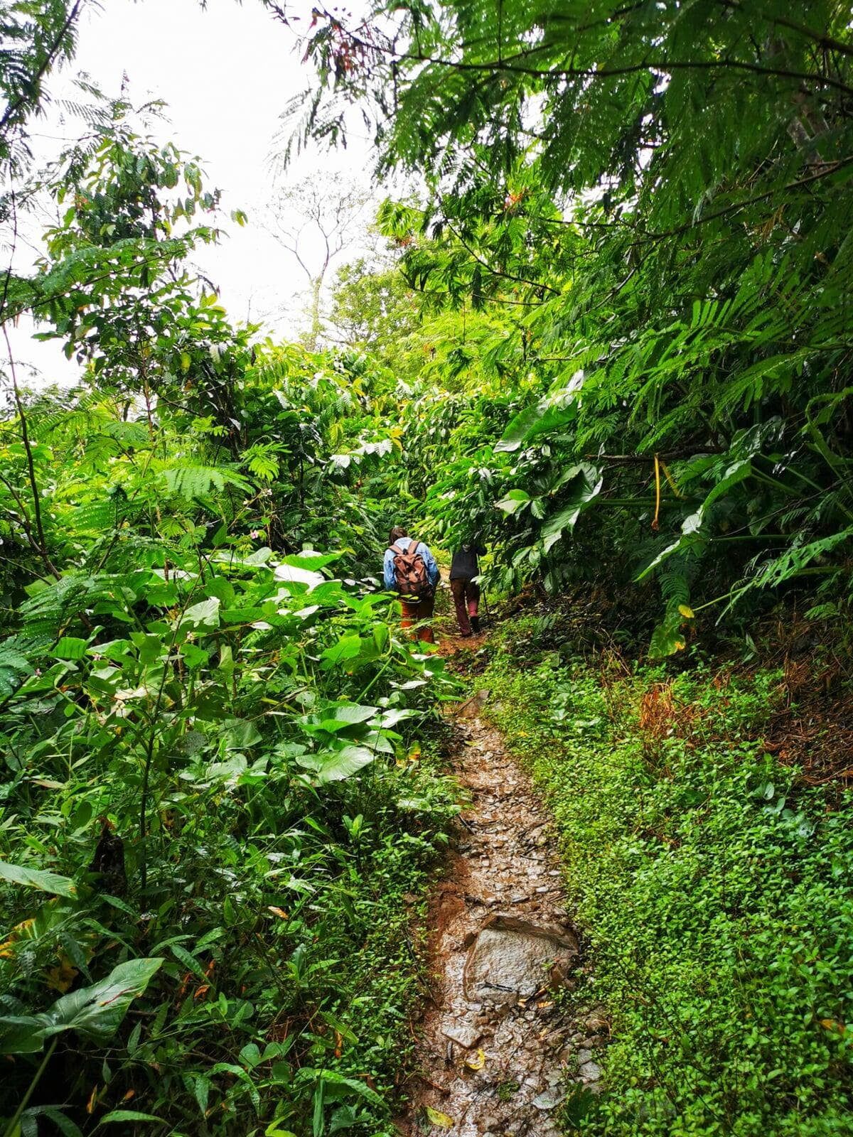 Luckily, our porter was a crafty one, improvising and surviving against all odds. With a cigarette casually clinging to his lips (because apparently surviving the jungle requires both fire and fashion), he eyed a nearby plant and, with the speed of a pit crew changing a tire, fashioned a makeshift rope from a sturdy root. With finesse, he secured Dian's loose sandal strap. He’s clearly a veteran of trailside fixes.