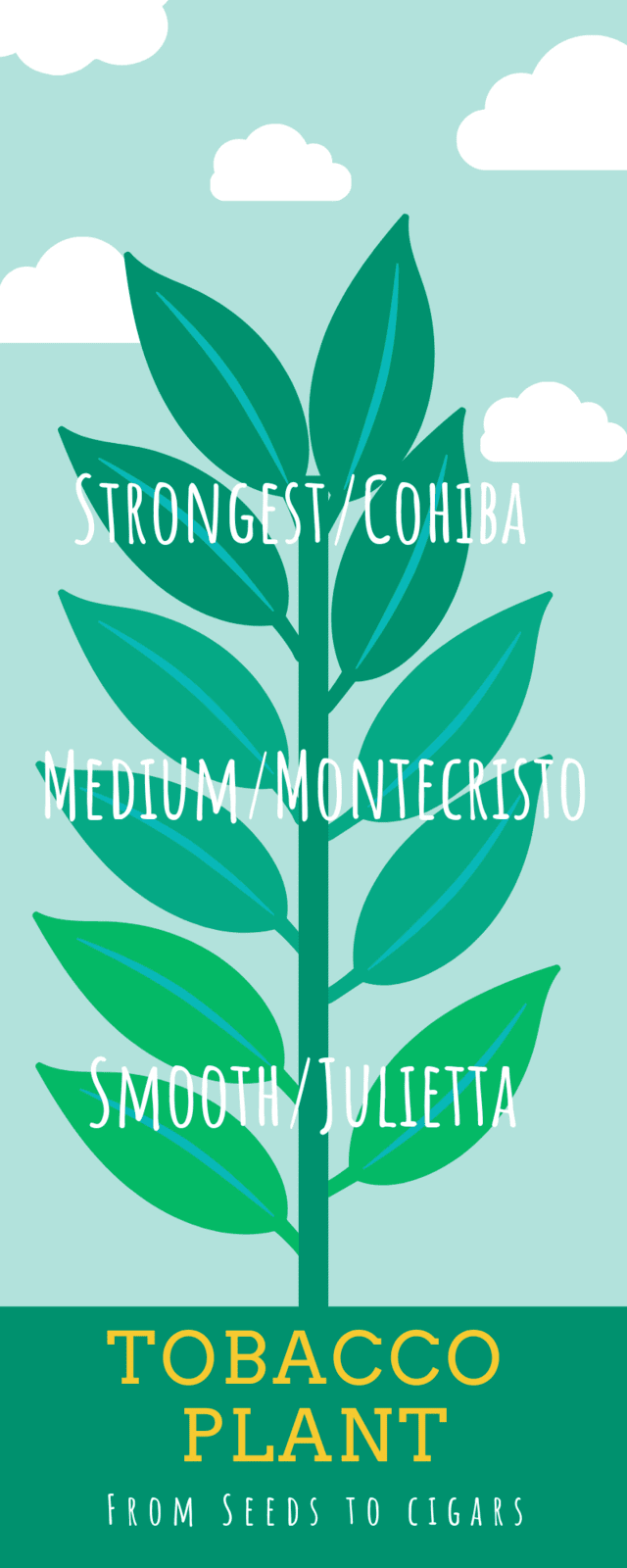 The leaves from the bottom of the stem have the smoothest flavor, which used to make smooth cigar preferred by the newbies like me such as Romeo and Juliet brand.